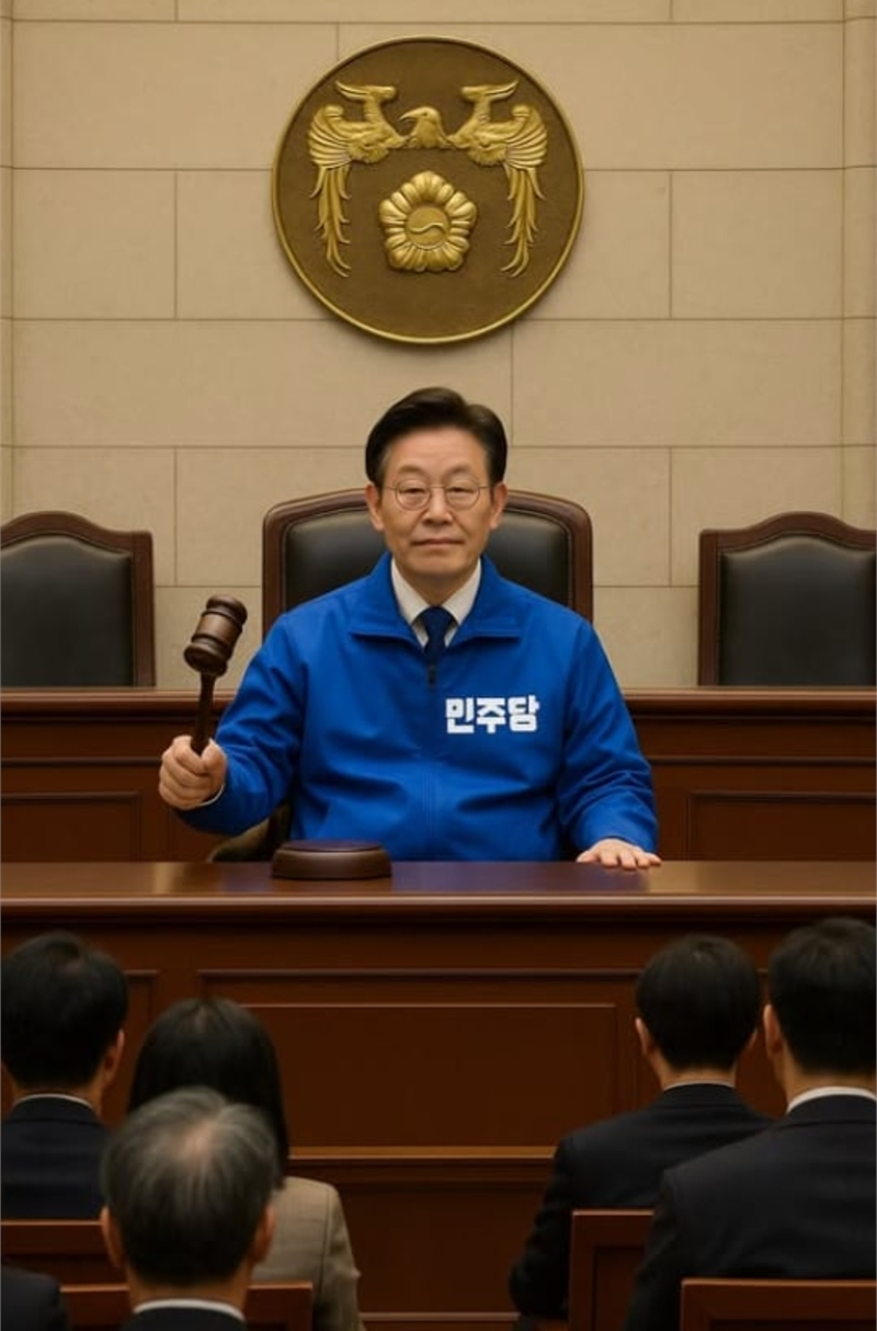 이 대표는 16일 자신의 페이스북에 이 대통령이 국회를 상징하는 봉황 표장을 배경으로 민주당 점퍼를 입은 채 법봉을 들고 있는 합성 사진을 올려 이같이 밝혔다.