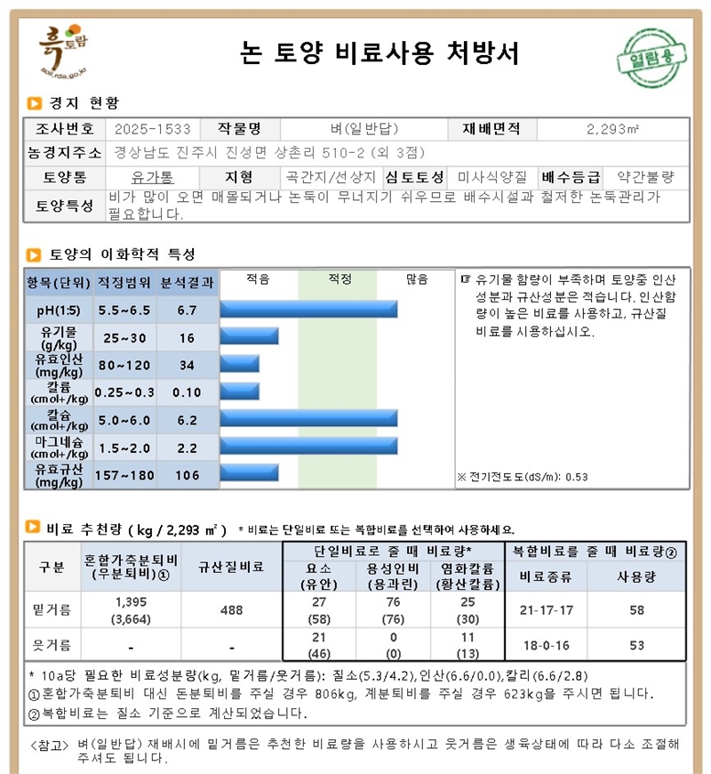 농촌진흥청 국립농업과학원이 운영하는 농업토양정보시스템 '흙토람'에서 토양 검사로 처방받은 비료사용 처방서 내용