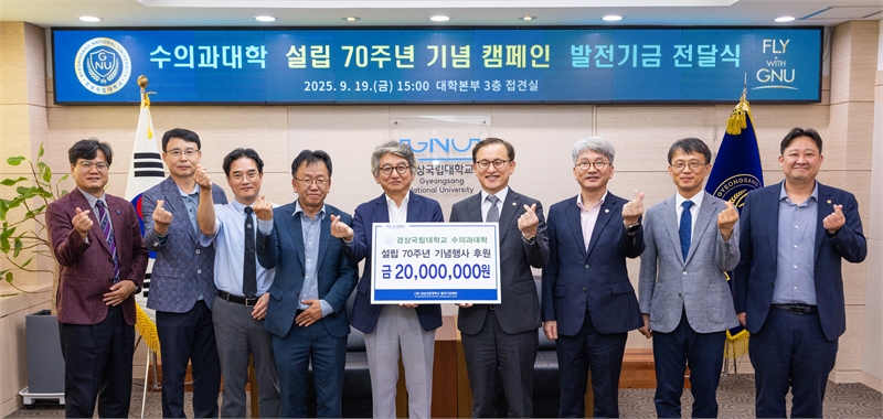 진주 동명고 졸업 수의사들 모임인 '동수회'는 19일 경상국립대를 방문해 경상국립대 수의과대학 설립 70주년 기념행사 후원 발전기금을 전달하고 있다. 경상국립대