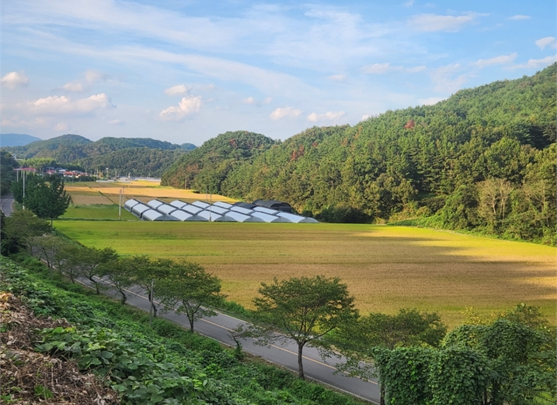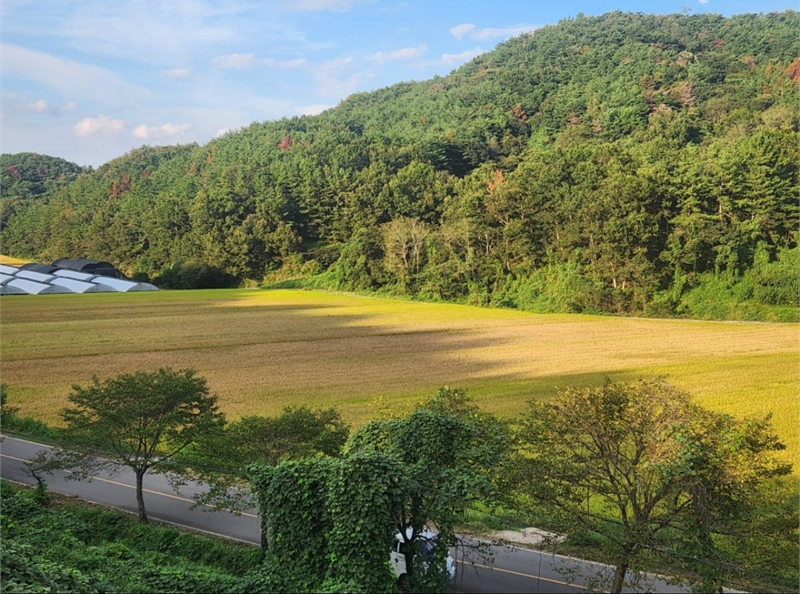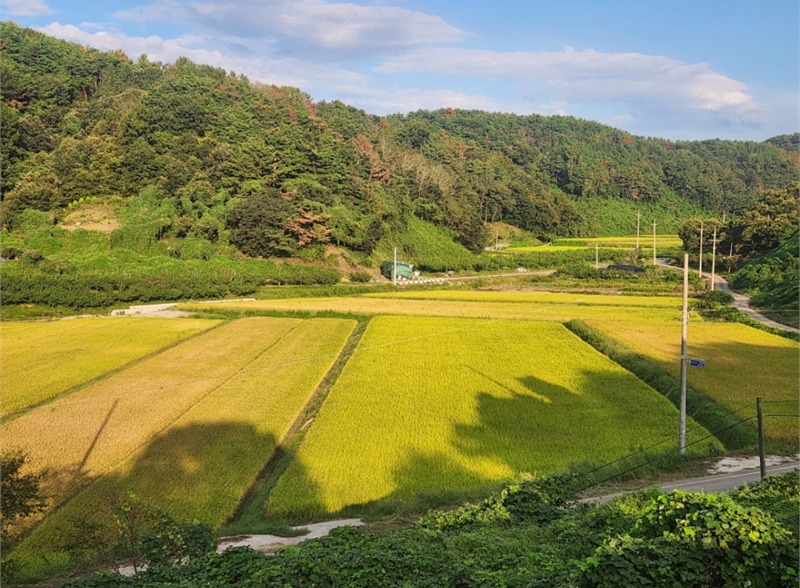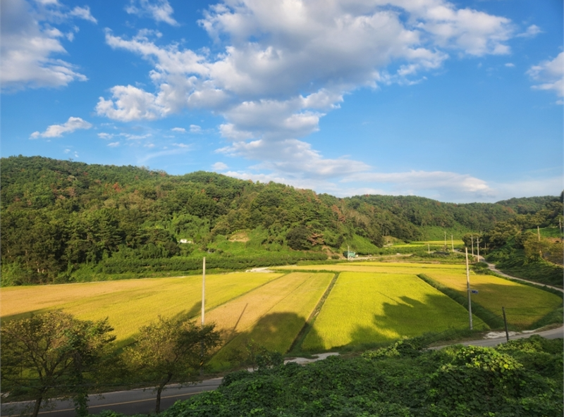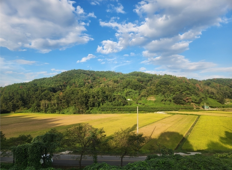푸른 하늘의 뭉개구름과 황금색으로 물들어가는 벼논 모습. 주변 야산이 이들 가운데 자리해 조화롭고도 아늑하고, 또는 풍요롭게 다가서는 가을 농촌의 풍경이다.