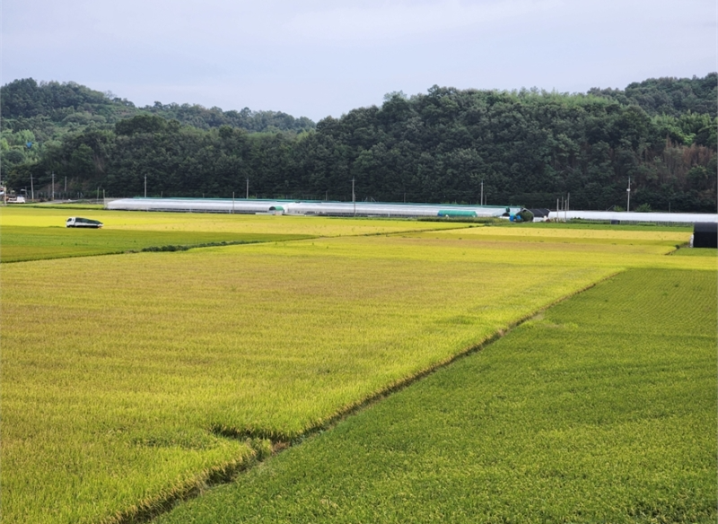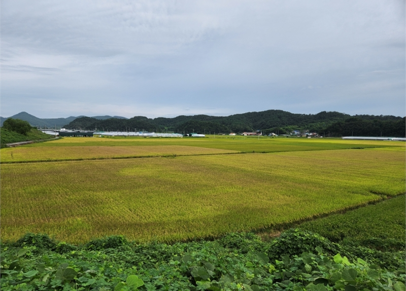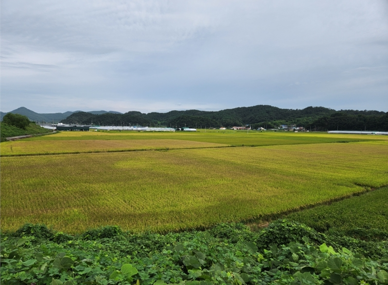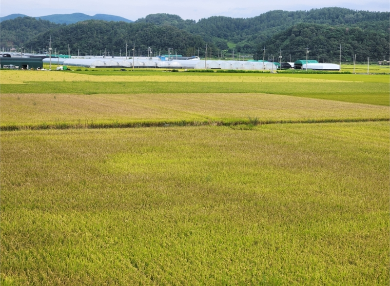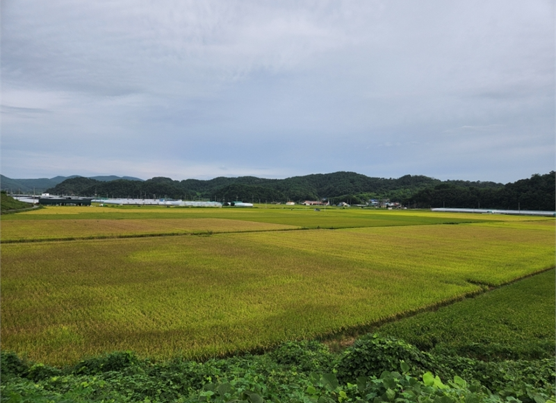 한여름 극한 호우에 '침수 생채기'를 경험한 마성 들녘 모습. 계절의 시간은 어김없이 흘러 어느듯 벼는 익어가고 있다. 벼논의 색이 선명하지 못하고 탁해 보이는 것은 침수 영향으로 보인다.