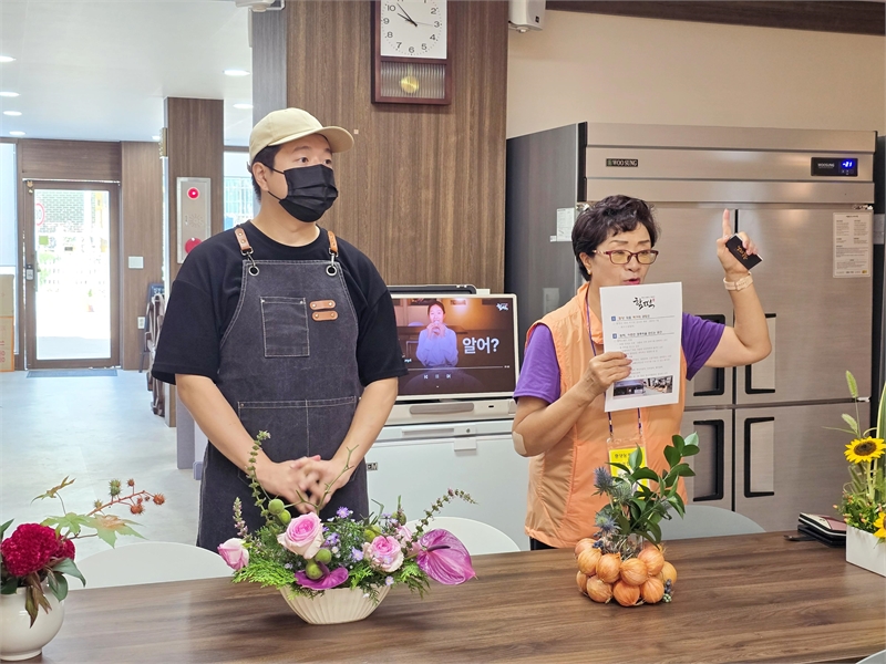장식은 함양꽃피우리동아리 회원들의 재능기부로 꾸며졌다. 함양 양파, 곶감, 들꽃을 활용해 전시 테이블을 장식해 특별한 느낌을 준다.