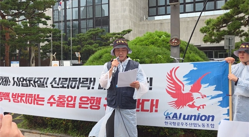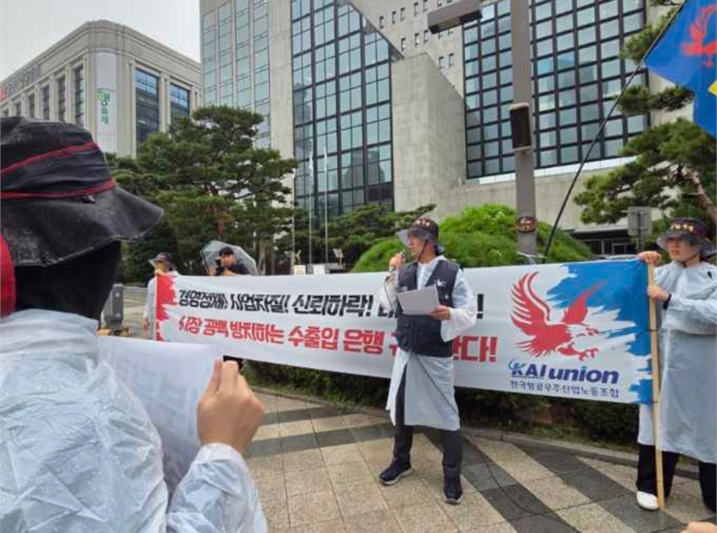 한국항공우주산업(KAI) 노동조합이 24일 오후 2시 가을비가 내리는 가운데 대주주인 한국수출입은행 서울 여의도 본사 앞에서 사장 인선을 촉구하는 집회를 열었다.