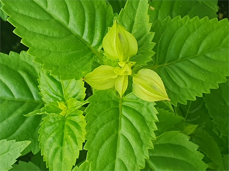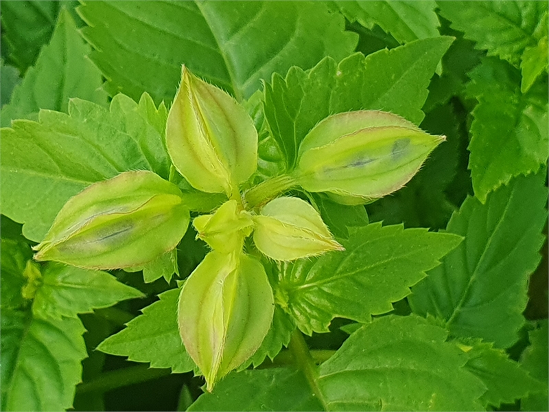 꽃은 총상꽃차례로 달리과, 화관은 통부분과 윗입술꽃잎, 아랫입술꽃잎으로 구성되어 있습니다.