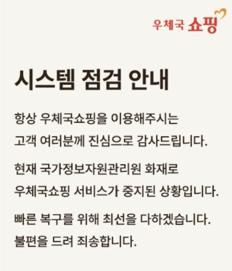 우정사업본부 '우체국 쇼핑' 홈페이지 사고 고지 내용