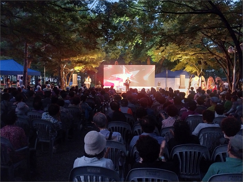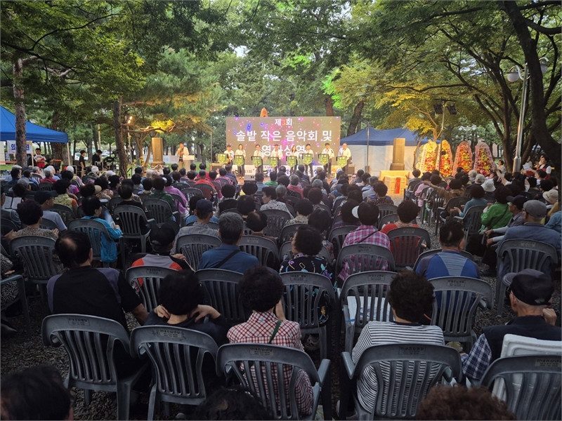 주민들이 지난 26일 진주시 상평동 송림공원에서 열린 '제3회 솔밭 작은 음악회 및 영화상영제'에서 공연을 즐기는 모습. 좌석이 가득찼다. 이상 진주시