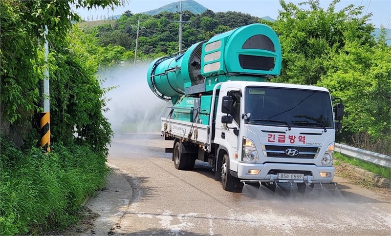 경남도 소독 방제차량이 축사 출입로를 소독하고 있다.
