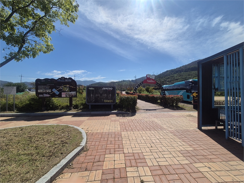 김해낙동강레일파크 입구 모습. 왼쪽 공원 안내판과 영화 '신의한수' 촬영지 안내판이 반긴다.