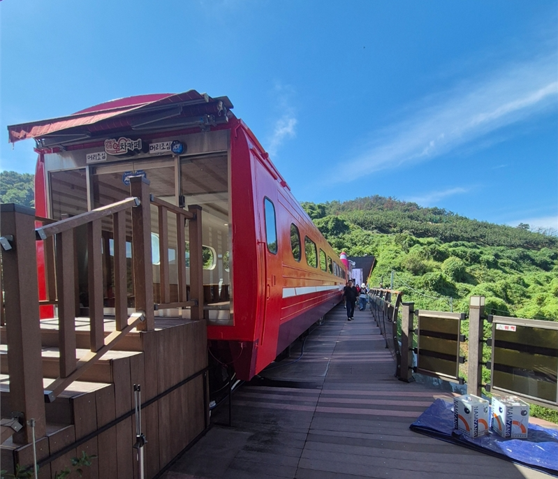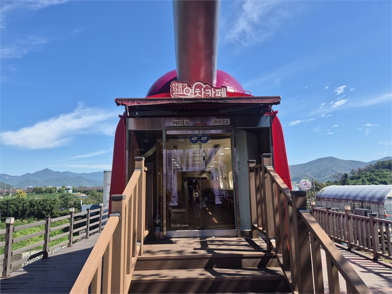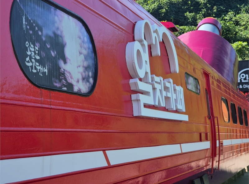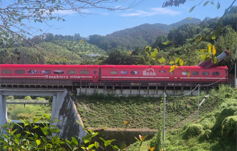 새마을열차 객차 두 량으로 만든 열차카페 모습. 빨간색으로 칠해 어린이들의 동심을 자극하고 있다. 열차카페 뒤에 와인동굴이 있다.