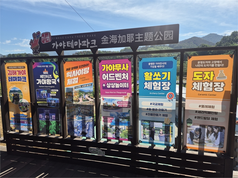 김해의 주요 관광지인 가야테마파크 안내판에 운영 중인 각종 프로그램들이 안내돼 있습니다.