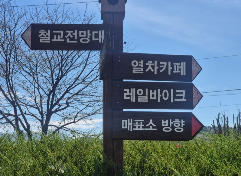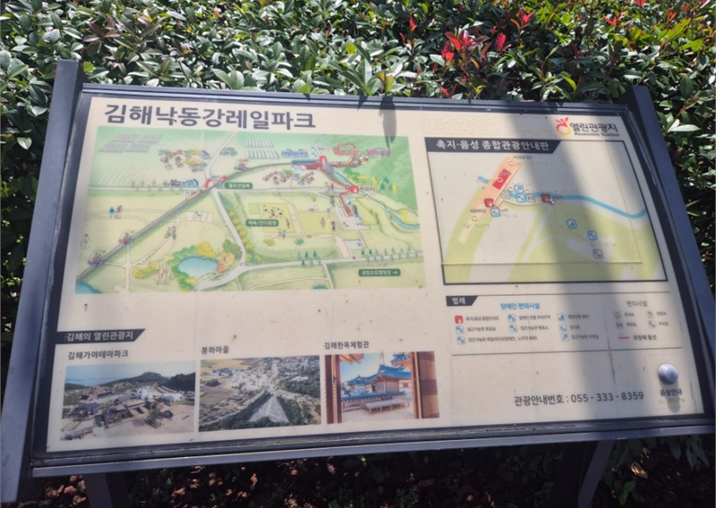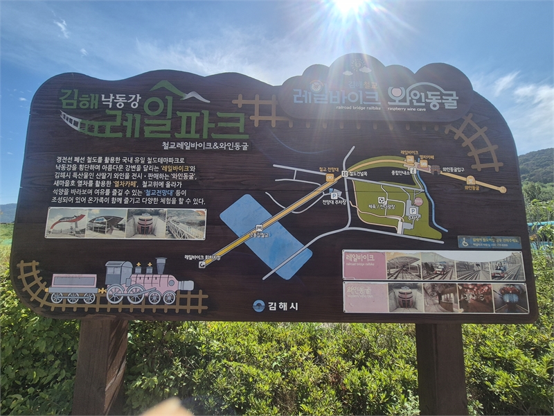 김해낙동강레일파크 안내판. 파크 내에서 레일바이크를 즐기고, 열차카페에서 휴식을 하고, 와인동굴을 구경할 수 있다.