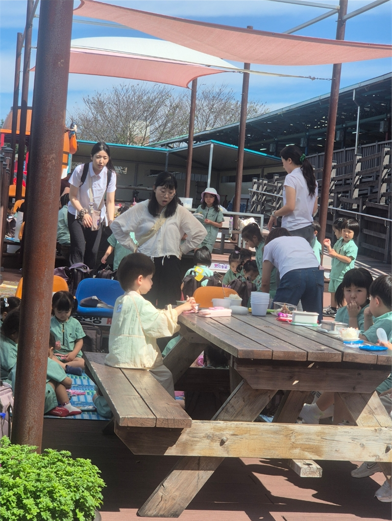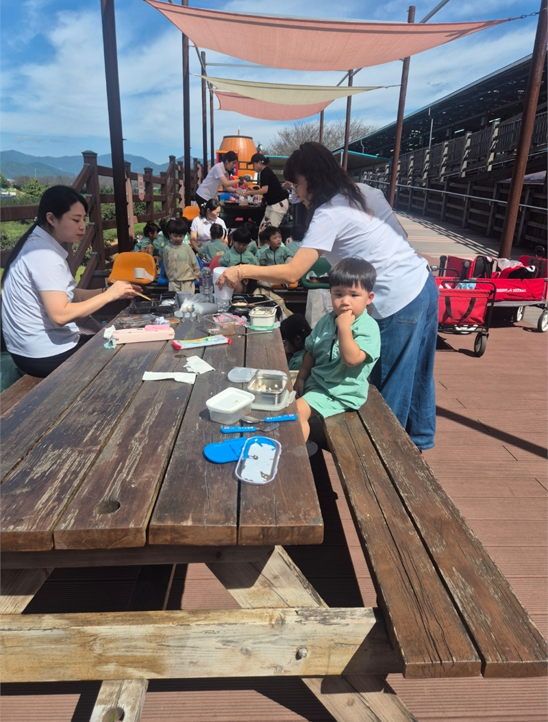 김해낙동강레일파크 구경을 마친 창원시립어린이집 아이들과 인솔 교사들이 식사를 하고 있다.
