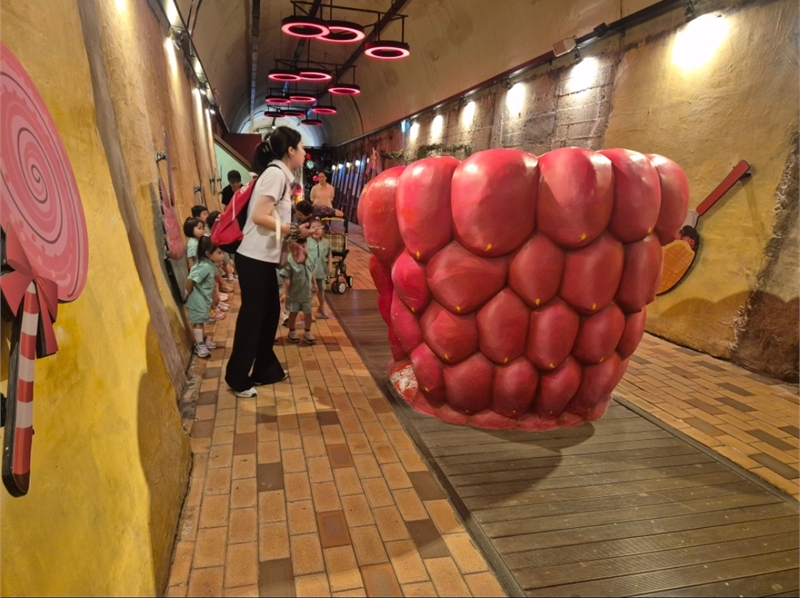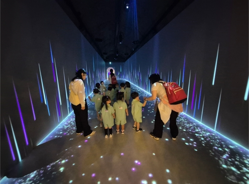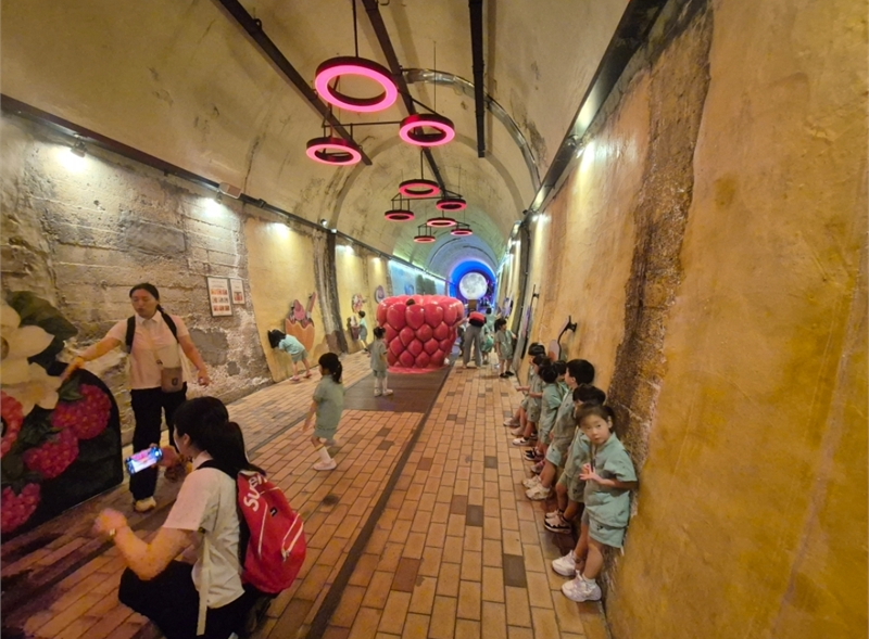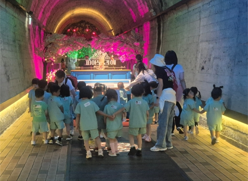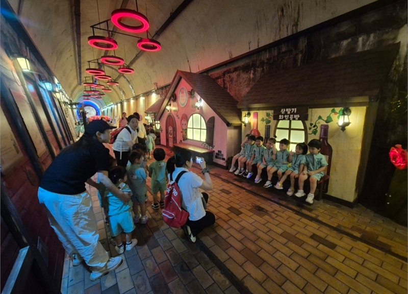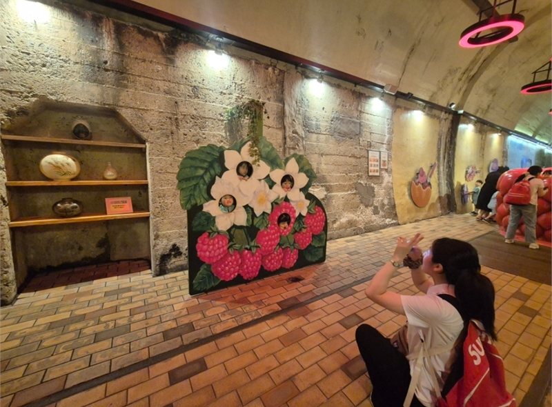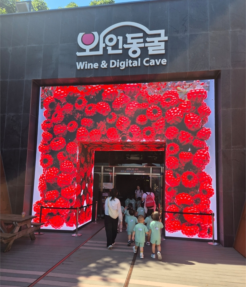 호기심 많은 아이들이 와인동굴을 들어서고 있다. 입구 스크린에 잘 익은 딸기가 표출되고 있다.