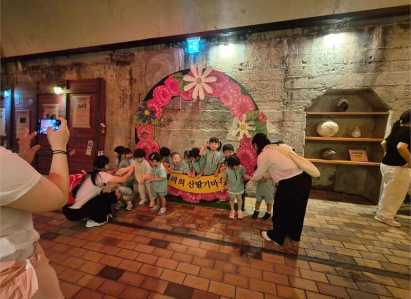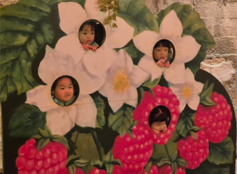 방문한 어린이들이 산딸기와 딸기 꽃잎 속에 얼굴을 내밀며 기념 사진을 찍고 있다.