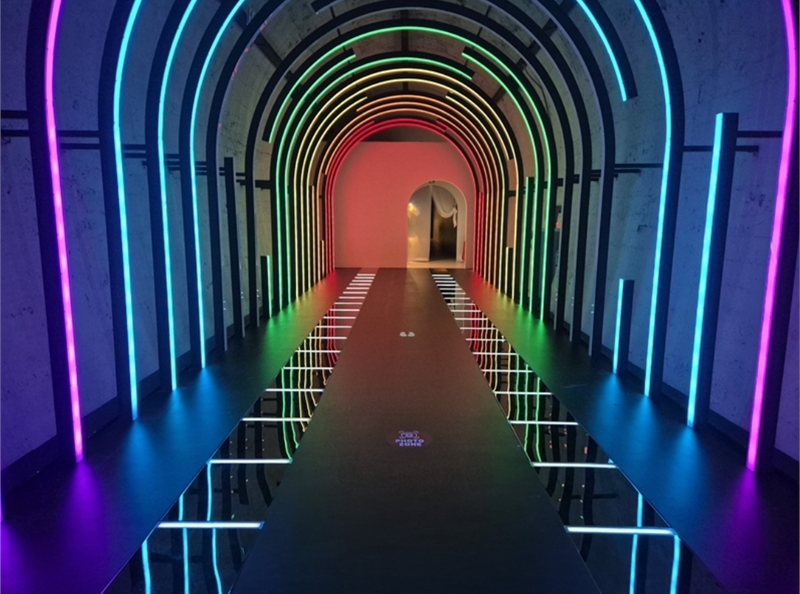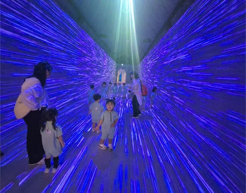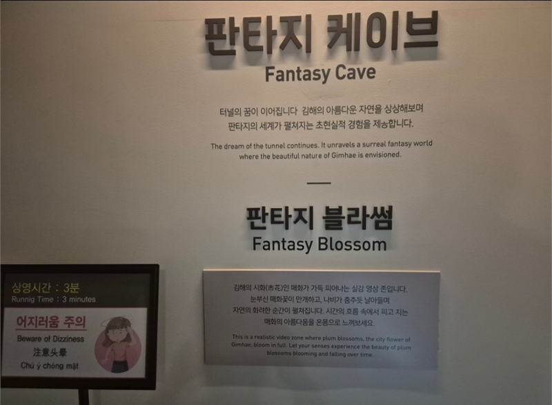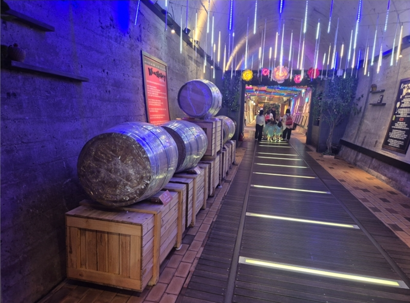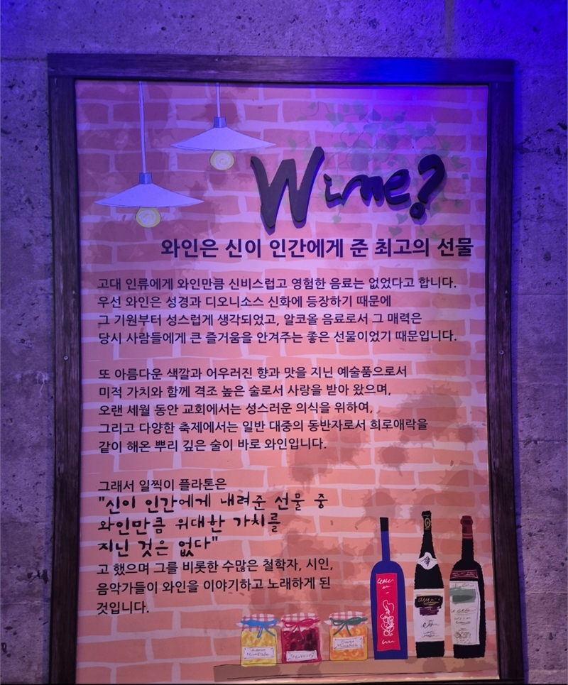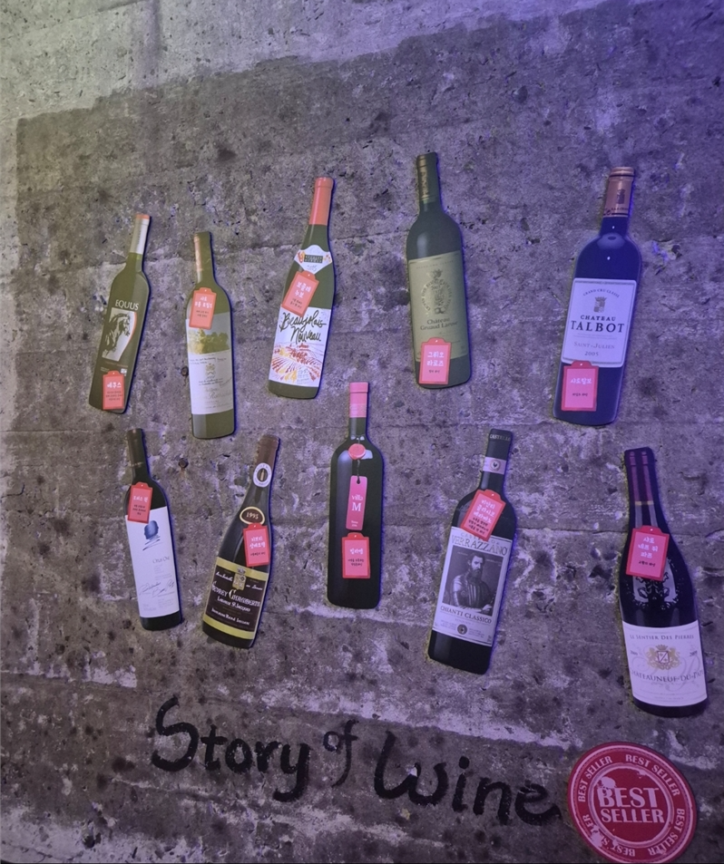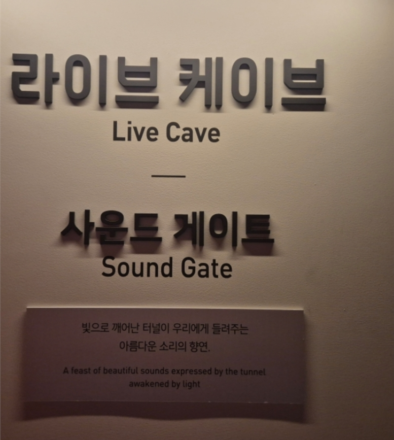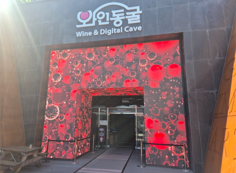 영어 안내판 'Wine & Digital Cave'처럼 와인의 향기와 디지털 기술을 접목한 빛의 예술이 어우러지는 특별한 공간입니다. Cave는 와인을 저장해 두기 위한, 환기가 잘 되는 지하방을 뜻하며 보툥 10∼12도를 유지합니다.