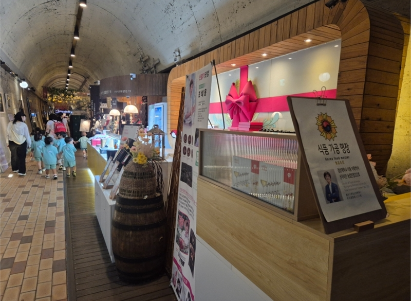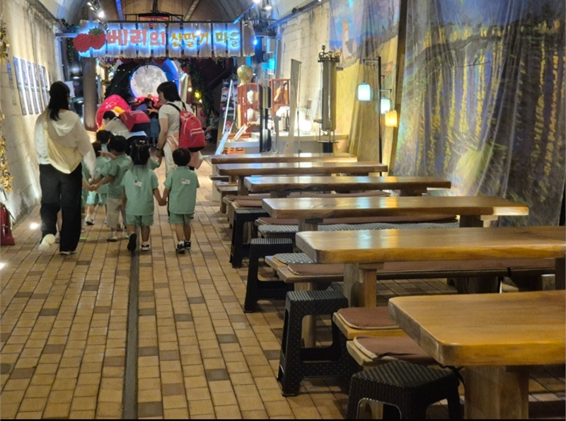 어린이들이 베리의 산딸기마을 코너로 들어가고 있다. 옆에는 성인들이 와인을 마실 수 있는 탁자가 놓여있다.