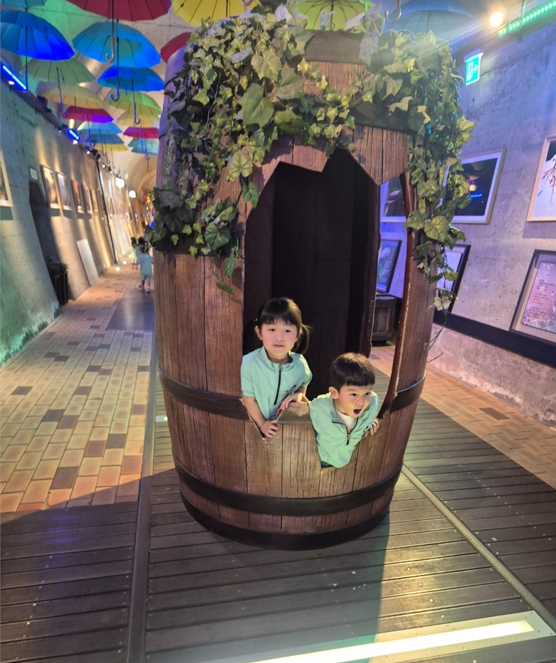 오크통으로 만든 포토존에서 아이들이 포즈를 취하고 있다.