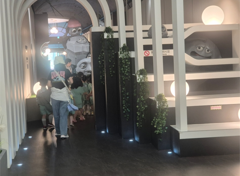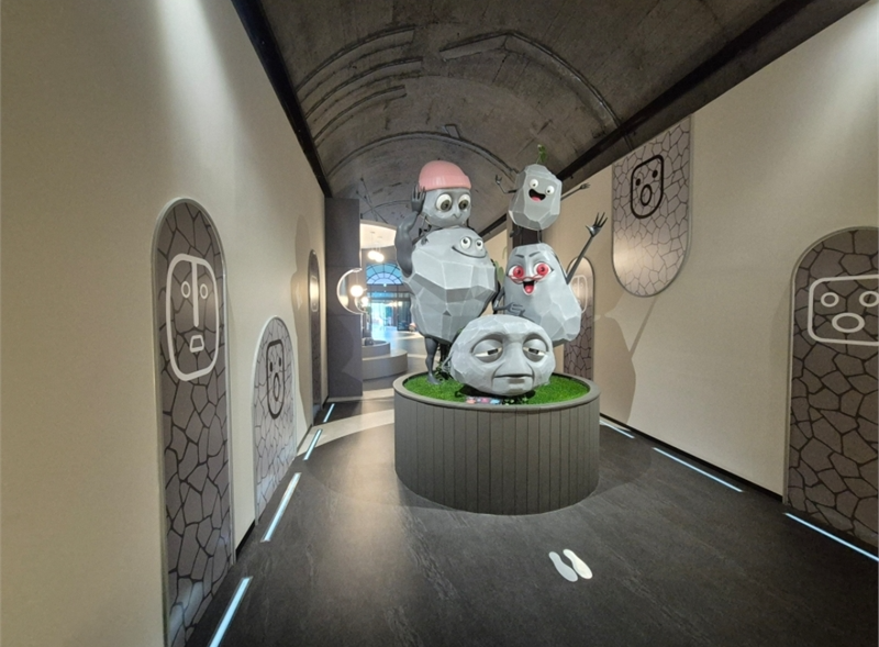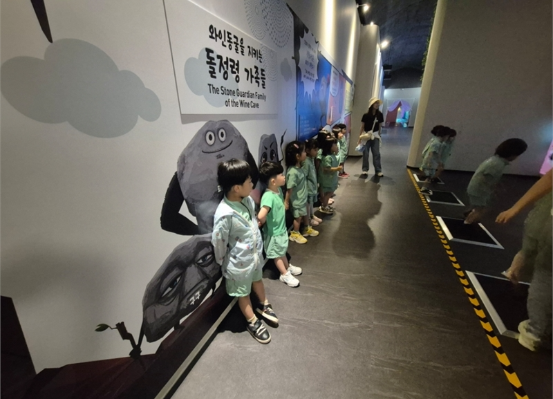 와인동굴을 지키는 돌정령 가족들 코너. 아이들이 화면과 음악에 따라 뜀박질을 하고 있다.