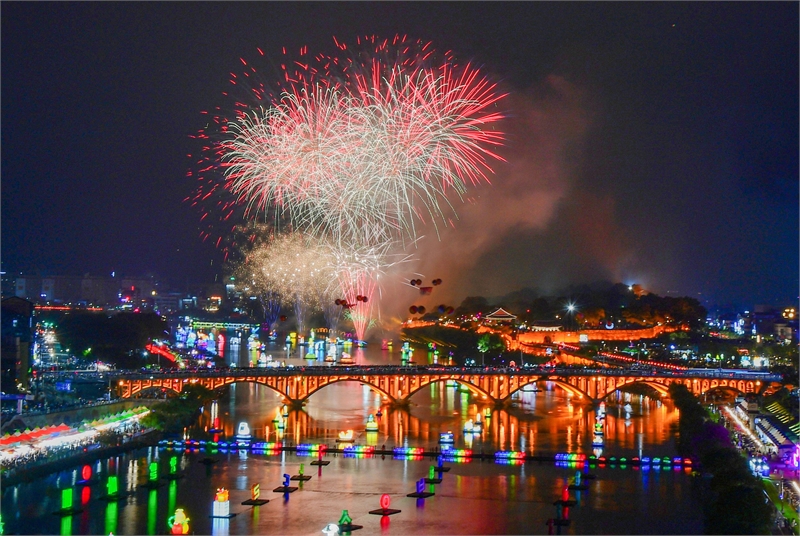 남강 진주교와 진주성을 배경으로 불꽃놀이가 진행되고 있다.