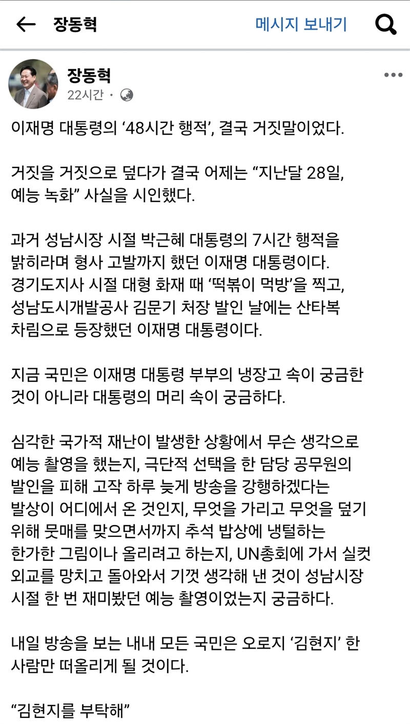 장 대표는 5일 자신의 페이스북에 올린 글에서 “이재명 대통령의 ‘48시간 행적’, 결국 거짓말이었다”며 “거짓을 거짓으로 덮다가 결국 어제는 ‘지난달 28일, 예능 녹화’ 사실을 시인했다”고 비판했다.
