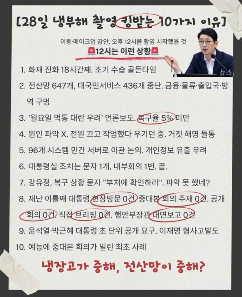 이어 "이 대통령이 '냉부해' 촬영에 나선 지난달 28일 오후 12시 무렵에 국정자원 화재로 전산망 647개, (이중) 대국민 서비스 436개가 중단되어 금융, 물류, 출입국, 방역에 구멍이 뚫린 초유의 상황이었다"며 "예능 촬영이 부적절한 상황임을 대통령실도 잘 알기에 법적 조치 협박까지 하며 촬영 날짜를 감추려 했고, 제가 추가 증거를 공개하고 나서야 이틀 만에 자백한 것"이라고 지적했다.