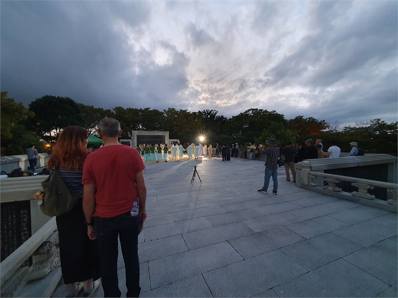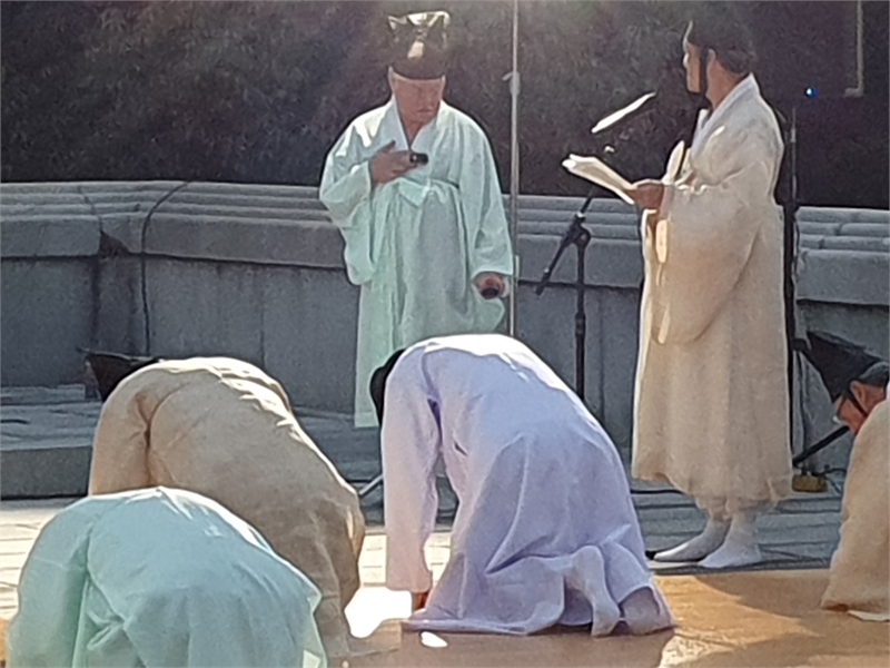 외국인 남녀가 고유제 행사를 시작부터 끝까지 지켜보고 있다.