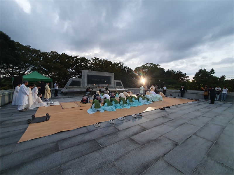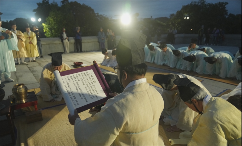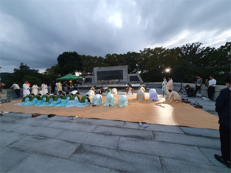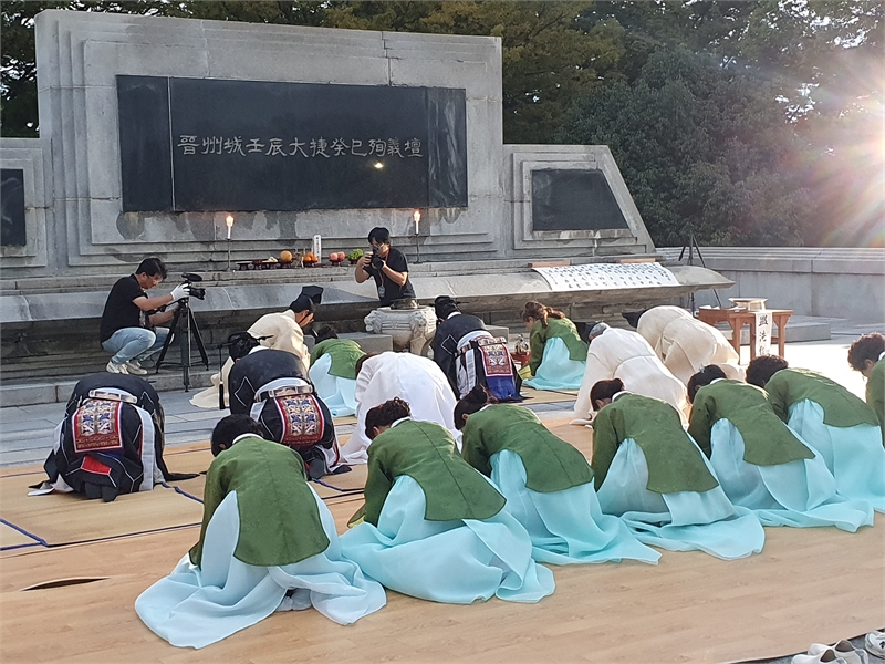 진주 '10월 축제' 첫 행사는 고유제입니다. 성균관유도회 진주지부가 주관해 이날 오후 6시부터 진주성 임진대첩 계사순의단 앞에 진행됐습니다.