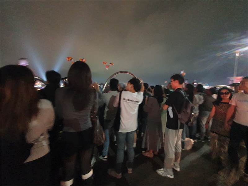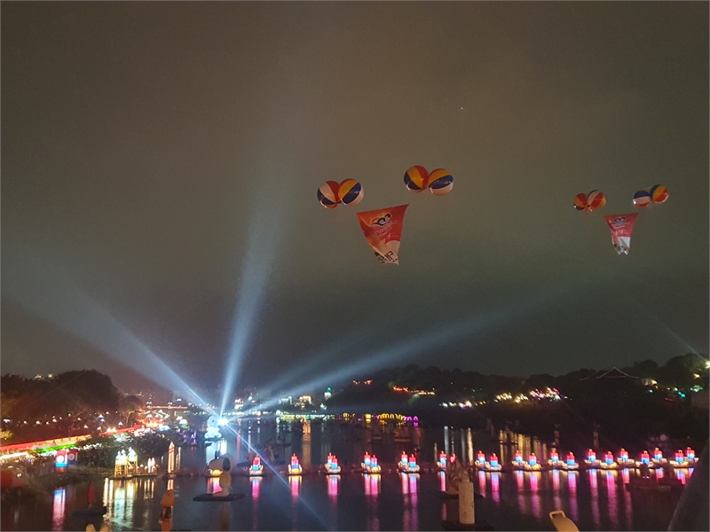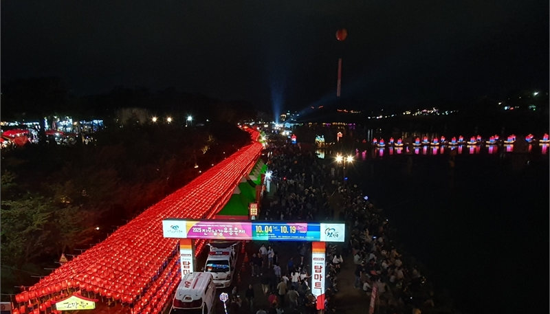 어둠이 내린 남강 하늘엔 축하 에드벌룬이 떠 있고, 부교(임시 다리)에는 청사초롱 불빛이 들어와 있다. 남강에 설치된 유등들엔 아직 불이 켜지지 않았다. 유등 불은 불꽃을 쏘아올리면서 들어온다.