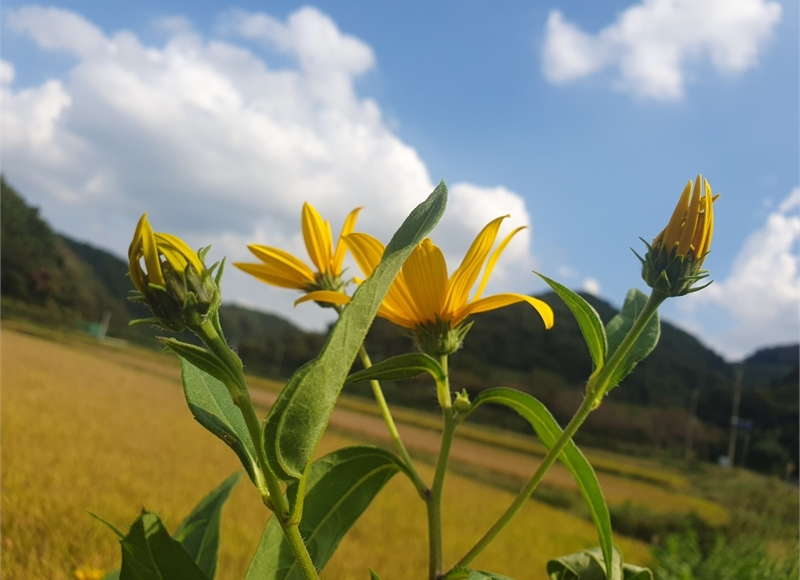 독자분들도 깊어 가는 이 가을에, 농촌 도로를 운전하거나 신작로를 걷다가, 큰 키에 투박해 보이는 잎에 하늘을 향해 노랗게 핀 꽃이 있으면 멈춰서 보기를 권합니다. 또 다른 가을 정취가 물씬 느껴질 겁니다.