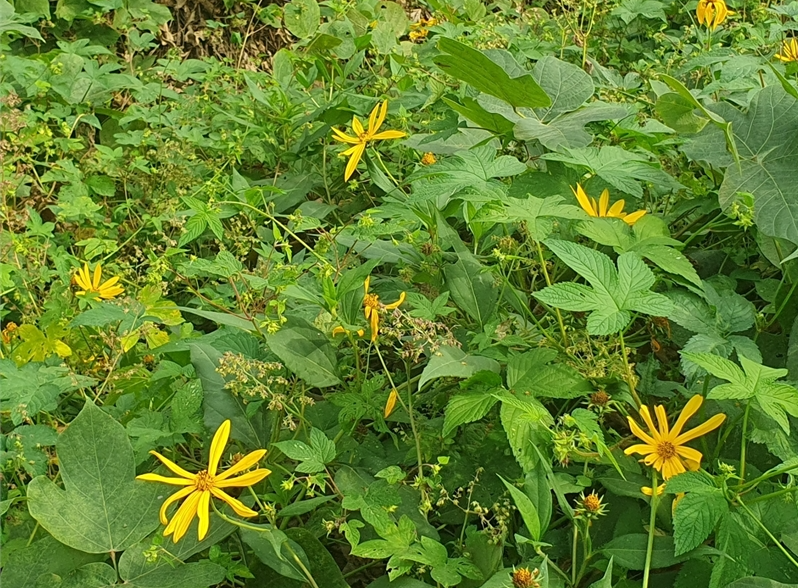 수풀 속에 드문드문 피어 있는 노란 돼지감자꽃