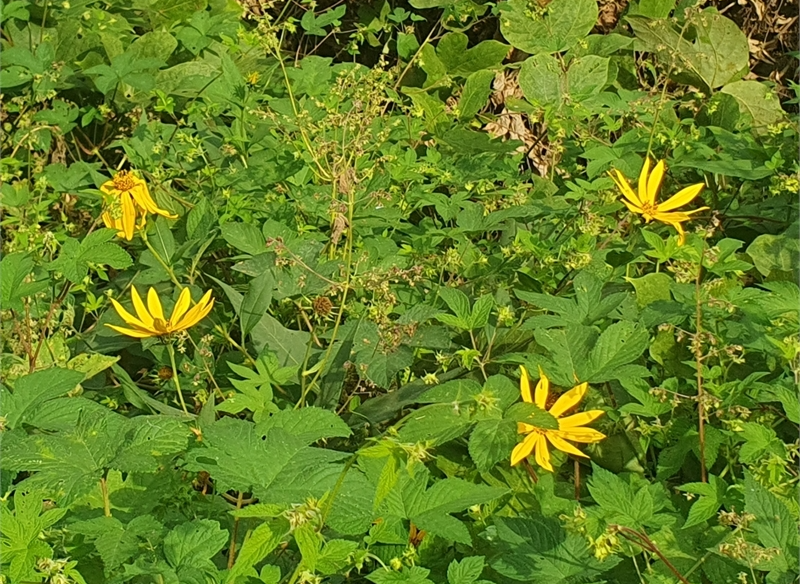 야생 돼지감자꽃이 보기 드물게 4개가 피거나 막 필 듯해 볼만하다.
