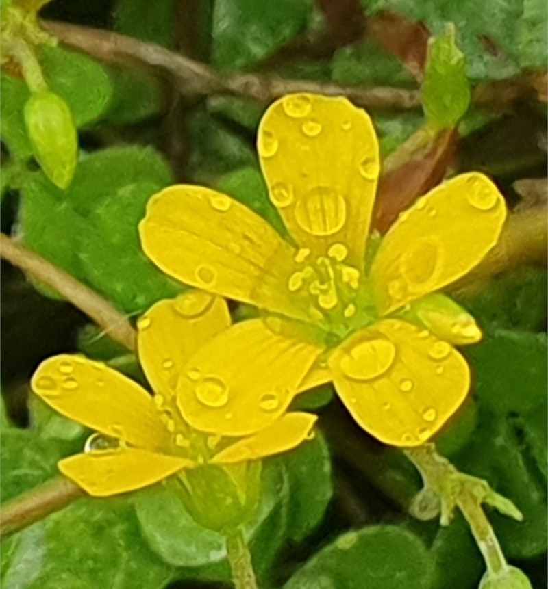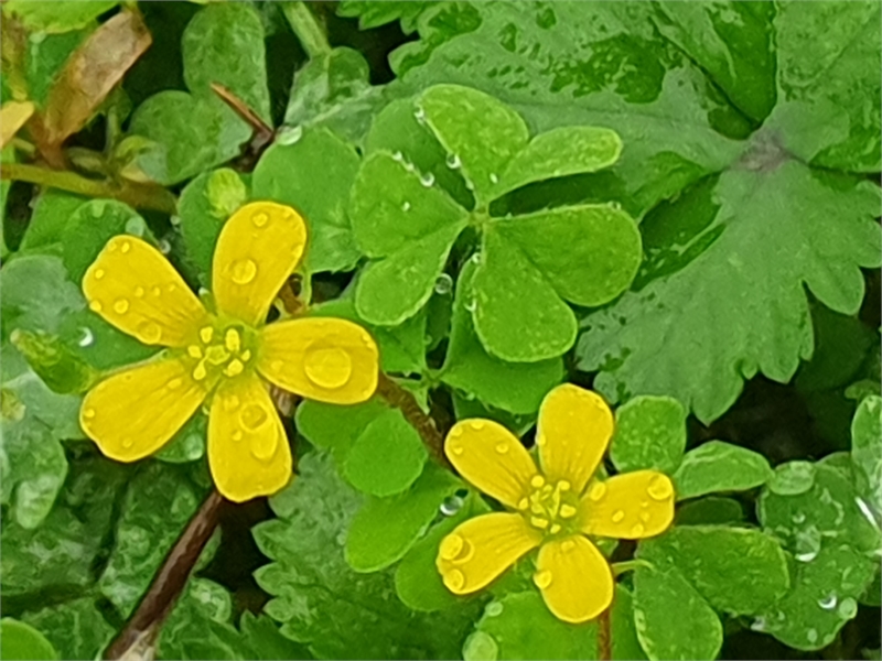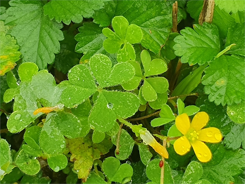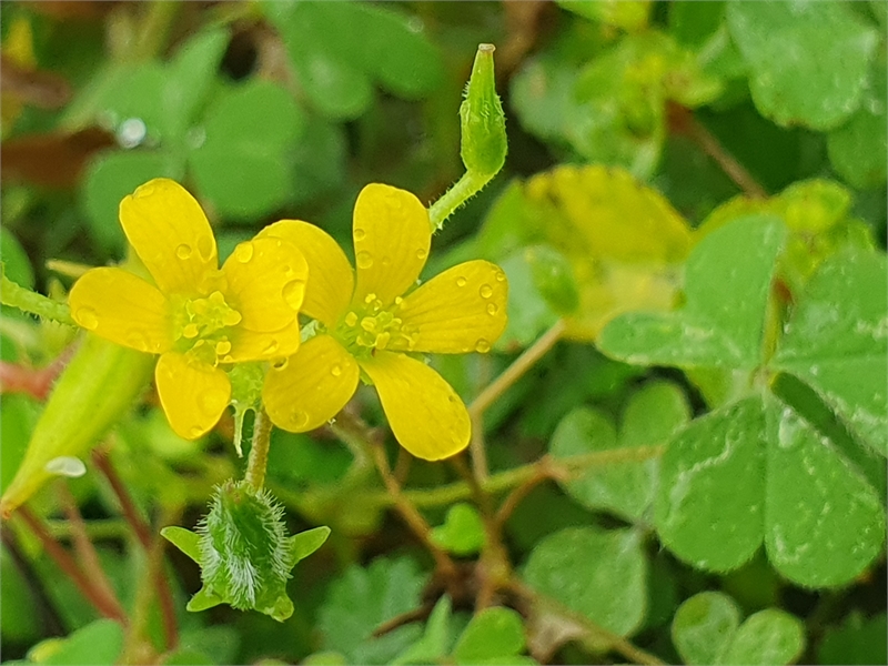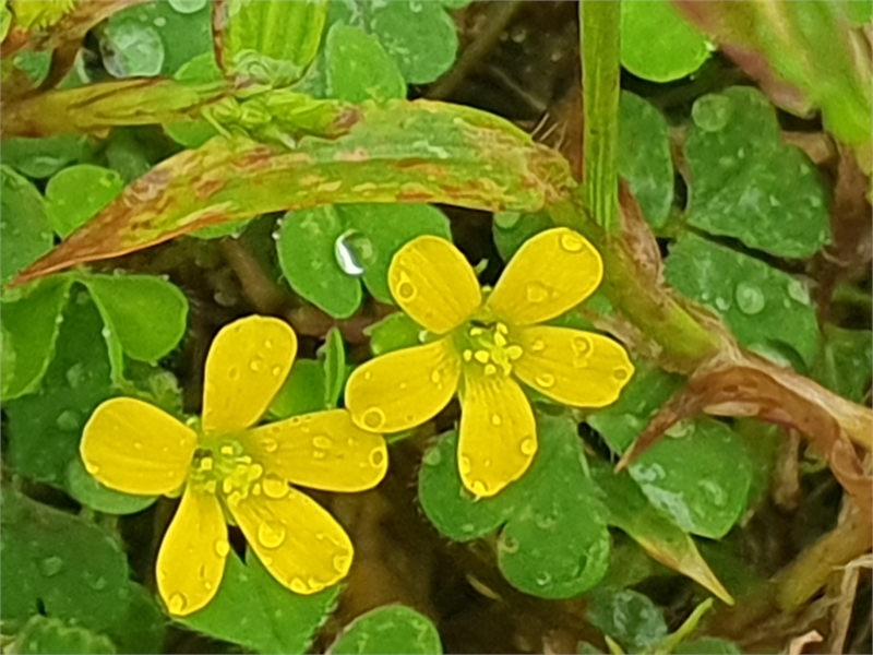 가을비에 젖은 괭이밥 꽃잎. 빗방울이 샛노란 꽃잎에 영롱하게 맺혀 무척 예쁘게 다가선다. 도란형인 꽃잎은 5개로 지름이 1~1.5cm 정도로 작다. 아래 꽃받침은 피침형으로 겉에 털이 나 있다.