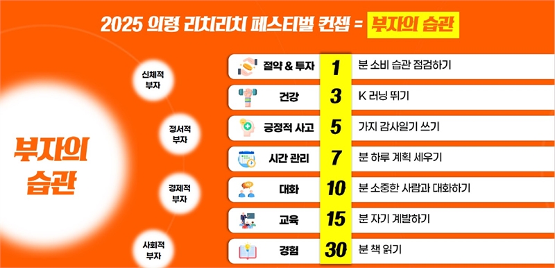 의령군은 지난해 ‘부자의 법칙’에 이어, 올해는 ‘K-리치웨이(K-Rich Way)’라는 이름 아래 절약, 건강, 긍정, 시간 관리, 소통, 교육, 경험 등 부자들이 실천하는 7가지 습관을 체험형 프로그램으로 구성했다.