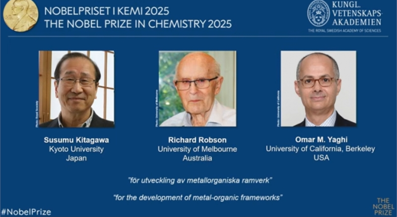 스웨덴 왕립과학원 노벨위원회는 8일(현지 시각) "2025년 노벨 화학상 수상자로 일본 스스무 기타가와(74) 교토대 교수, 호주 멜버른대 교수인 리처드 롭슨(88·영국 출신), 미국 UC버클리대 교수인 오마르 M. 야기(60·요르단 출신)를 선정했다”고 밝혔다.