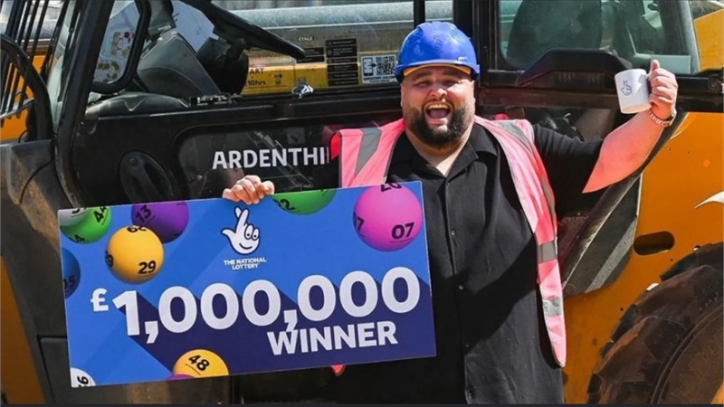 100만 파운드(약 19억 원) 복권에 당첨된 아담 로페즈 씨가 당첨 팻말을 들고 환호하고 있다. BBC 캡처