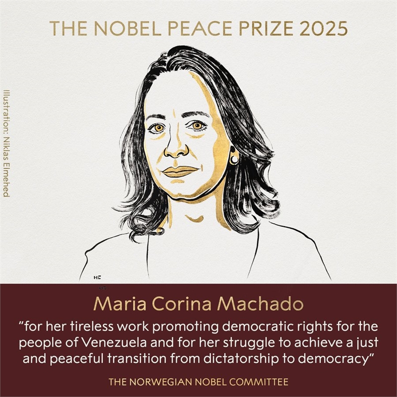 노르웨이 노벨위원회는 10일 2025년도 평화상 수상자로 베네수엘라 독재 정권에 맞서 민주화 운동을 이끌어 온 여성 야권 지도자 마차도를 선정했다고 밝혔다.