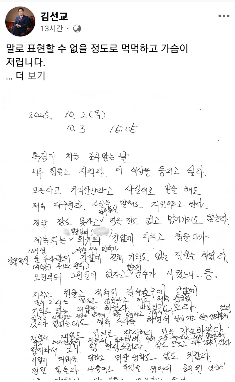김선교 국민의힘 의원이 10일 자신의 페이스북에 공개한 양평군 단월면장 A 씨의 자필 메모