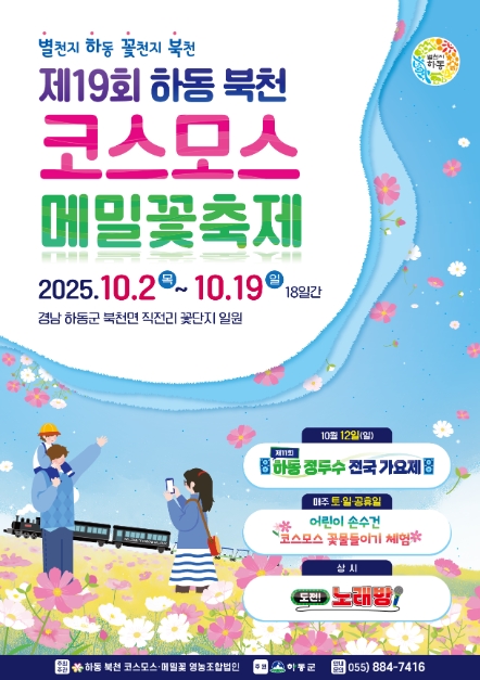 경남 하동군 북천면에는 ‘제19회 북천 코스모스·메밀꽃 축제’가 한창이다. 축제는 2~19일간의 일정으로 ‘별천지 하동, 꽃천지 북천’을 주제로 진행 중이다.