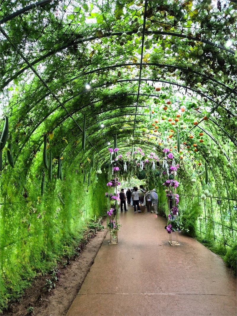 희귀 박 터널 관람객이 붐빈다. 박 터널을 구경하며 지나면 행운이 들어온다는 콘셉트로 만들었다.
