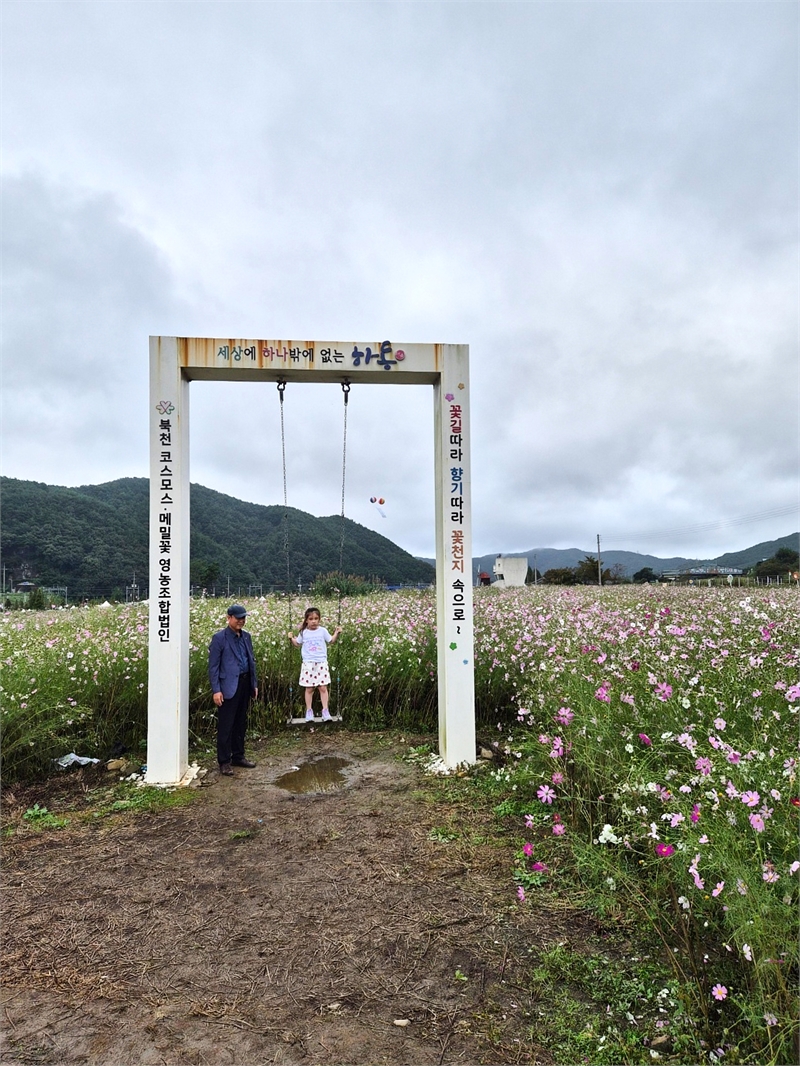 코스모스꽃을 배경으로 방문 기념사진을 찍을 수 있는 사진존. 아이가 할아버지와 그네를 타는 포즈를 취하고 있다. 아이에겐 성년이 된 이후 '인생사진'이 될 수 있다.