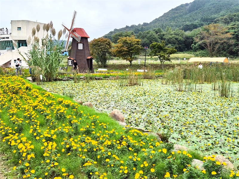 연못 옆에 가을 국화가 노랗게 피어 운치를 더한다.