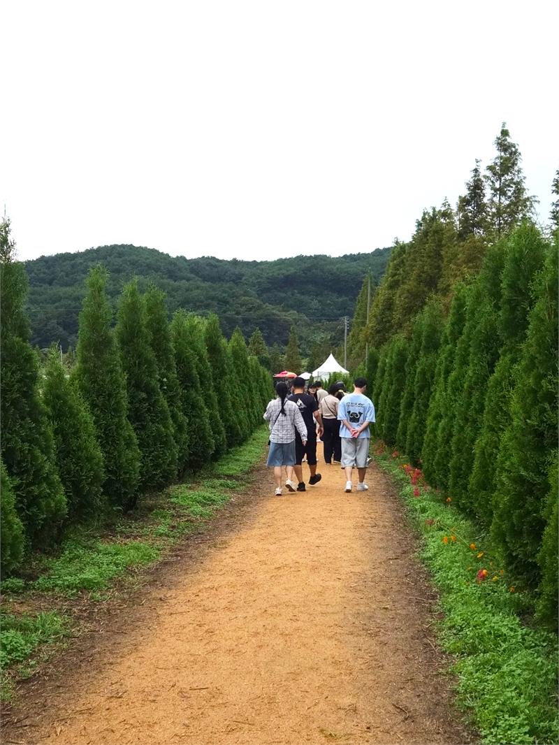 축제장 방문객들이 정원수나 울타리용 나무인 에메랄드그린(측백나무과) 길을 한가롭게 거닐며 휴식을 취하고 있다. 코스모스꽃과 메밀꽃을 구경하다가 지루해지면 걸을만한 곳이다. 이상 독자 정주현 씨 제공