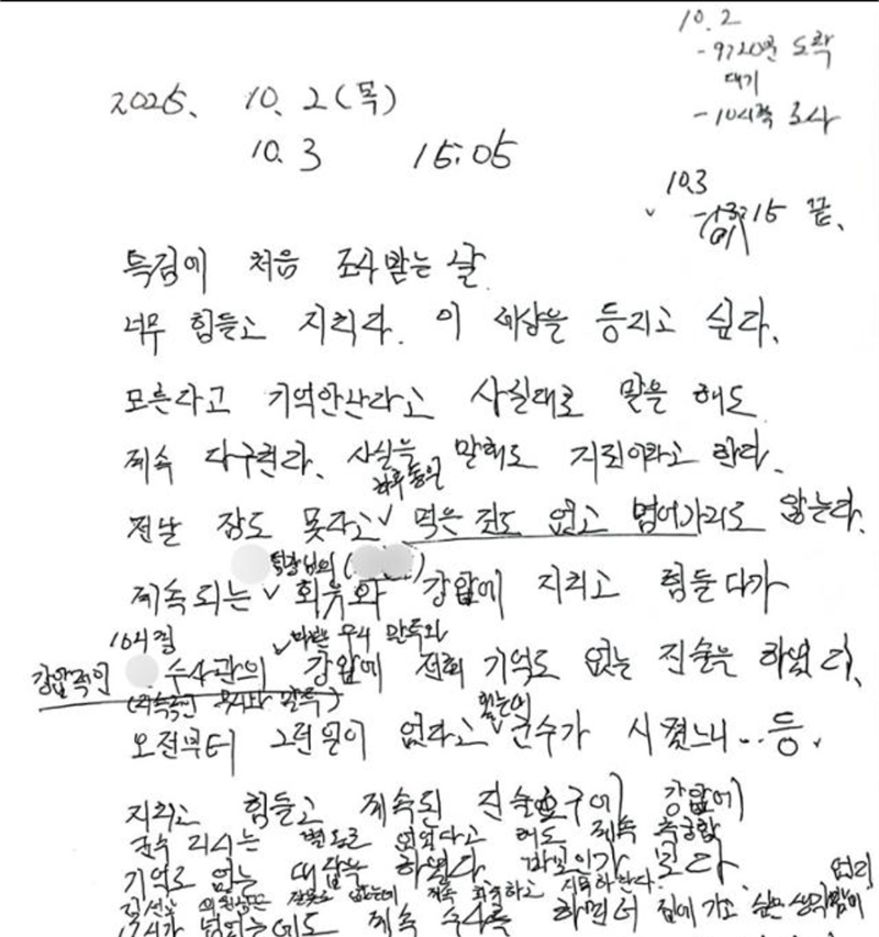 하지만 정 씨는 특검의 주장과 달리 조사 다음 날인 3일 자로 자필로 작성한 메모에서 “모른다고, 기억이 안 난다고 솔직히 말해도 계속 다그친다”, “지속되는 회유와 강압에 지치고 힘들다”, “이렇게 치욕을 당하고 직장생활도, 삶도 귀찮다”, “나름대로 주민을 위해서 공무원 생활을 했는데, 자괴감이 든다” 등 특검 수사에 대한 커다란 부담을 호소했다.