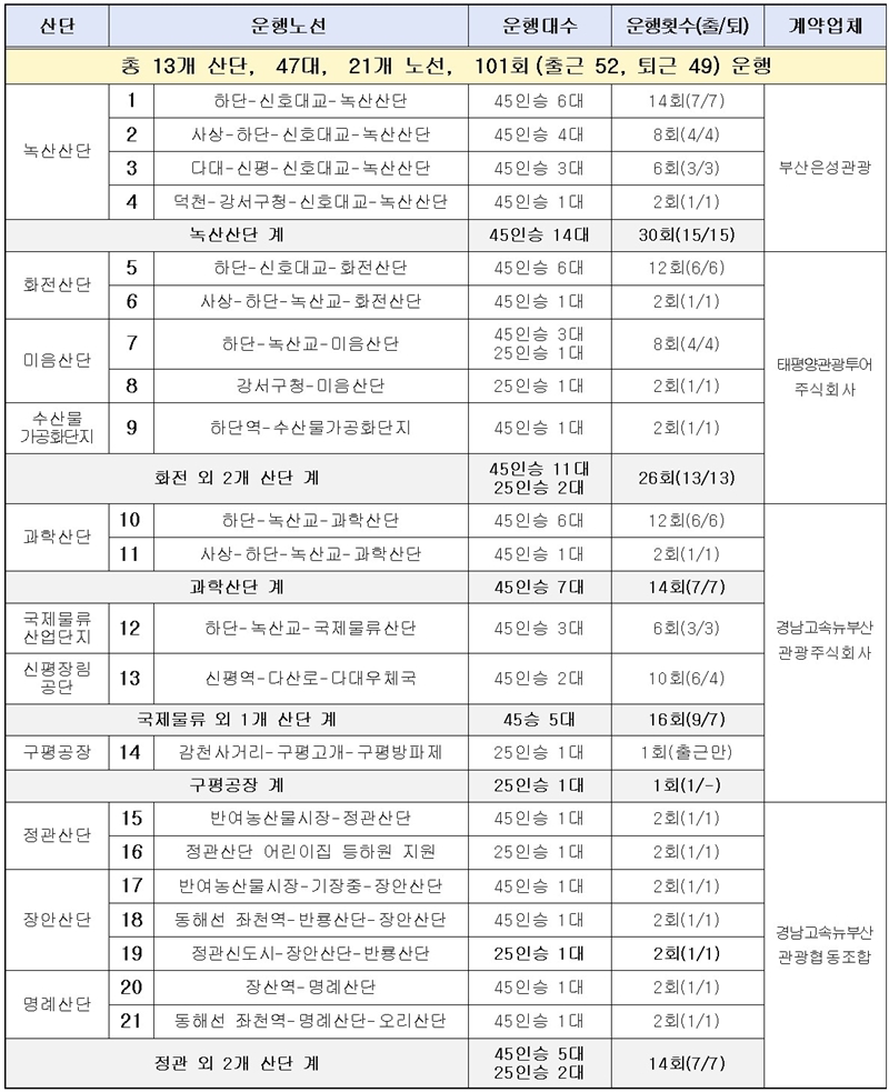 부산시 산단별 통근버스 운행 현황 (2025년 10월 1일 기준). 이상 부산시
