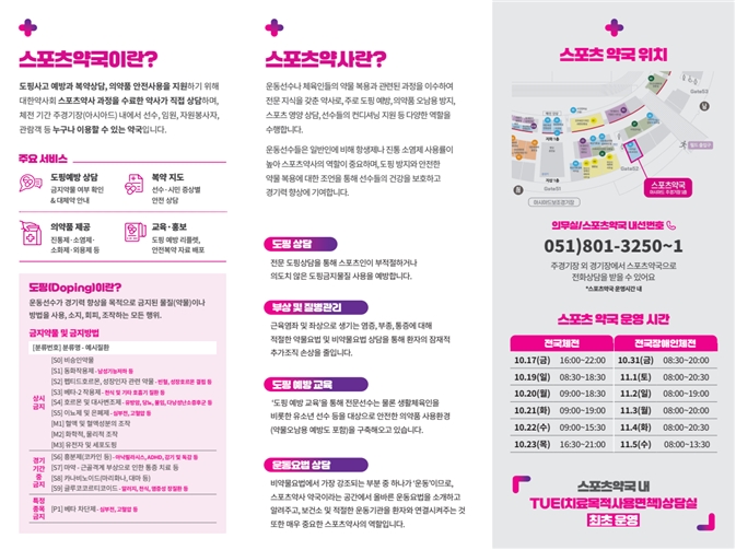더불어 주경기장 외 외부 경기장에서 선수들이 도핑 관련 상담이 필요한 경우 ▲주경기장 스포츠약국(051-801-3250~1)과 ▲'스포츠약사찾기'(대한약사회 스포츠약사 누리집, sports.kpanet.or.kr/search/area.php)를 활용한 유선 상담도 가능하다.