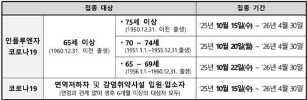 어린이(2012년 1월 1일∼올해 8월 31일 출생자),임산부, 연 나이 75세 이상(1950년 12월 31일 이전 출생) 어르신 접종은 현재 진행 중이며, 70∼74세는 오는 20일부터, 65∼69세는 22일부터 무료 독감 예방접종을 받을 수 있다.