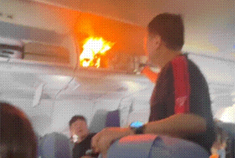인천행 여객기 수하물 선반 안 리튬 배터리가 폭발해 화재가 발생한 모습. 더우인