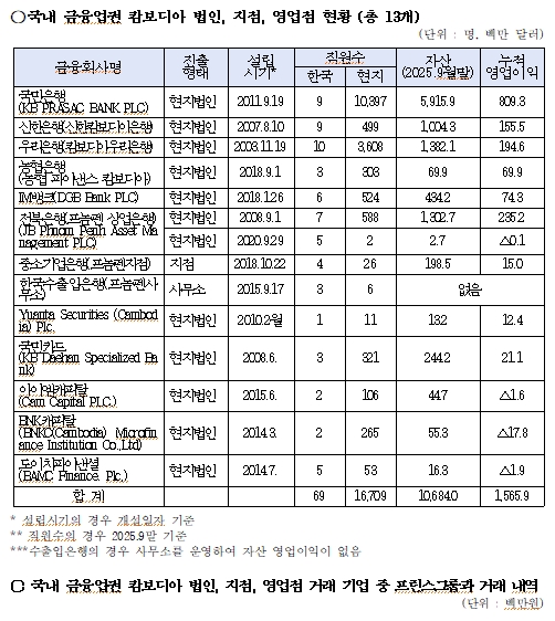 국회 강민국 의원실(경남 진주시 을)이 금융감독원에서 받은 '국내 금융업권 캄보디아 법인, 지점, 영업점 운영 현황'에 따르면 지난 9월 말 현재 총 13개 금융사가 현지에 진출해 있다.