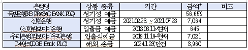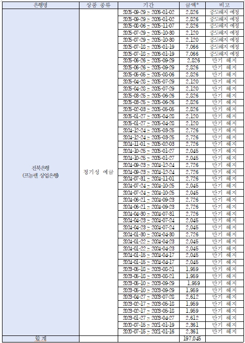 국민은행은 정기성 예금(1건)으로 566억 5900만 원, 전북은행 268억 5천만 원(정기성 예금 7건, 우리은행 70억 2100만원(정기성 예금 1건), 신한은행 6억 4500만원(입출금 예금 1건) 순이다.