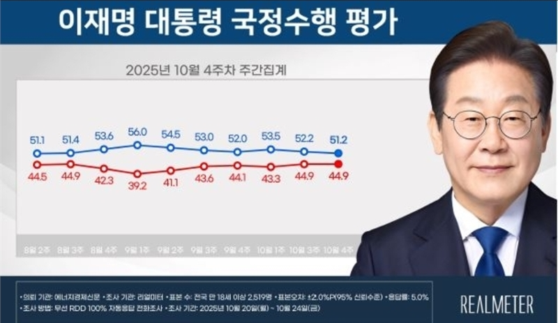 리얼미터가 에너지경제신문 의뢰로 만 18세 이상 2519명을 대상으로 한 조사에서 이 대통령의 10월 넷째주(20~24일) 국정수행 지지율은 전주보다 1.0%포인트 하락한 51.2%였다.